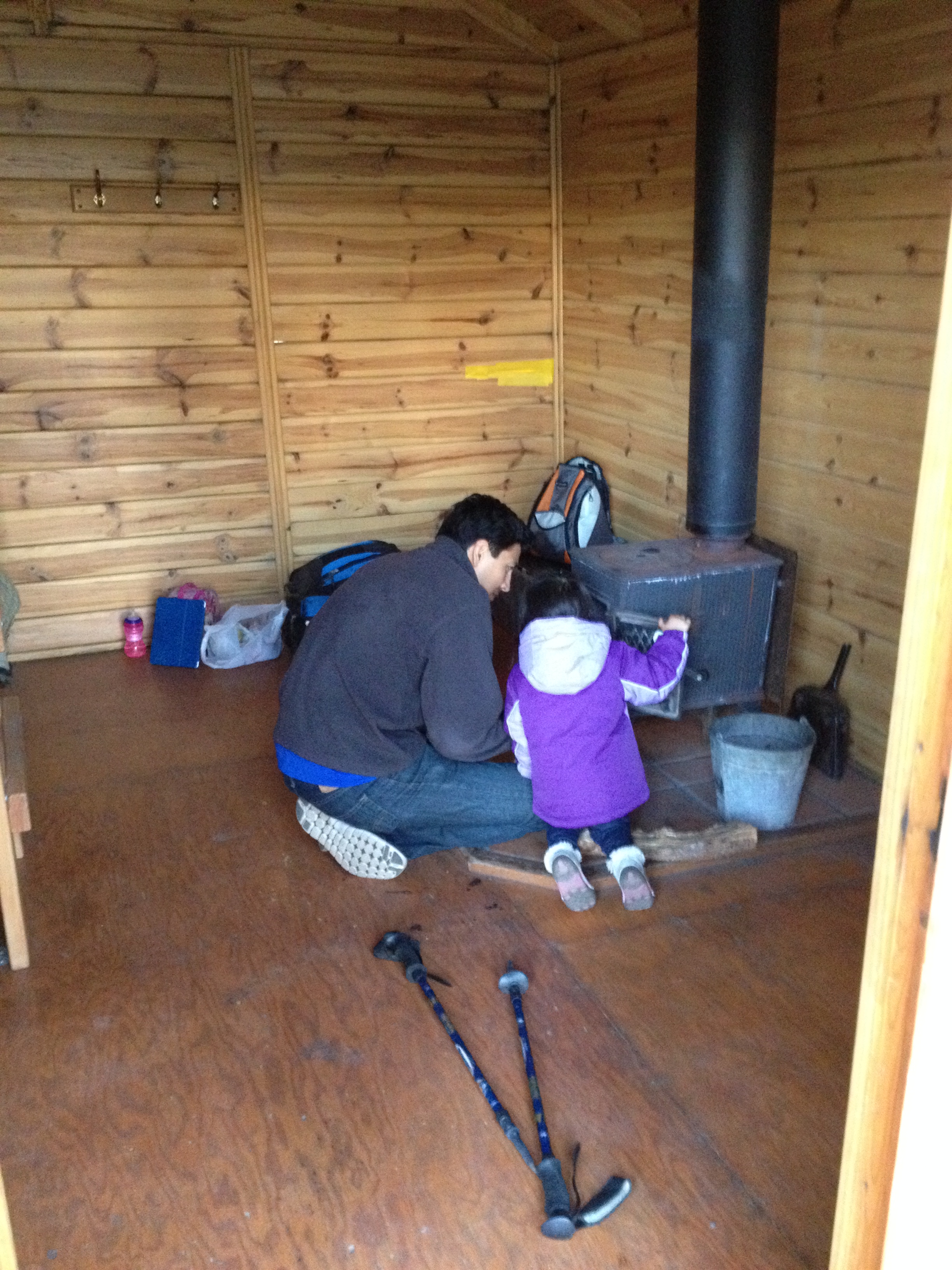 - The right side of our cabin. Our daughter is seen here assisting my husband in starting the (very small) stove fire.
