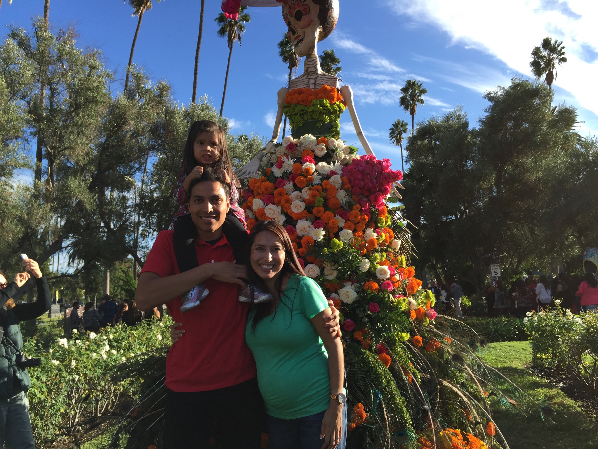 A family shot of the three of us in front of a Quinceañera representing Day of the Dead