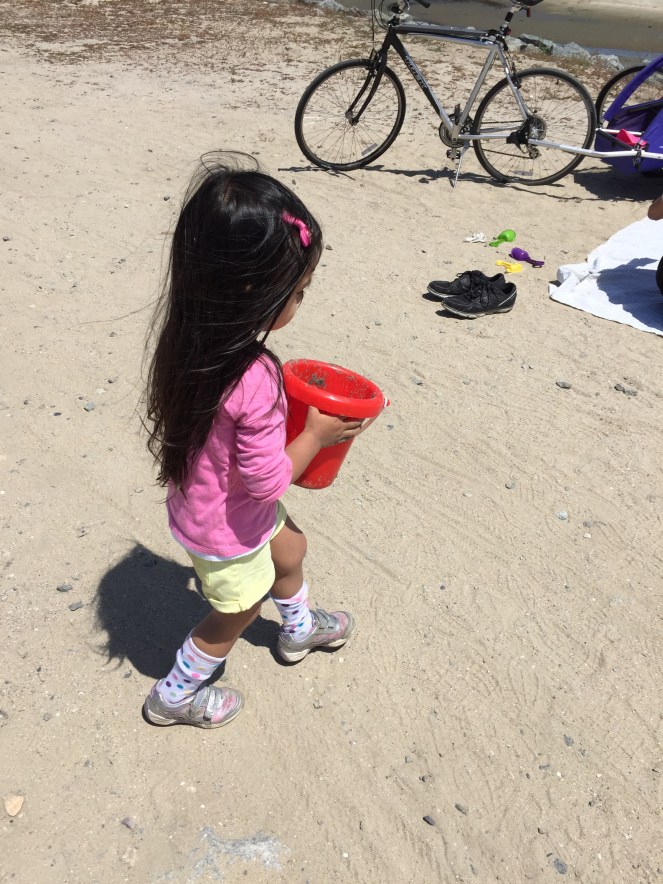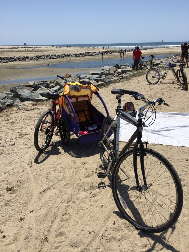 So there we were, pedaling the two miles to the beach with my husband pulling Celeste on the Burley Bee and Elysse snug on his back in the Ergo Baby Carrier, and me following close behind on my own bike. I have to say, it was a totally cute sight.