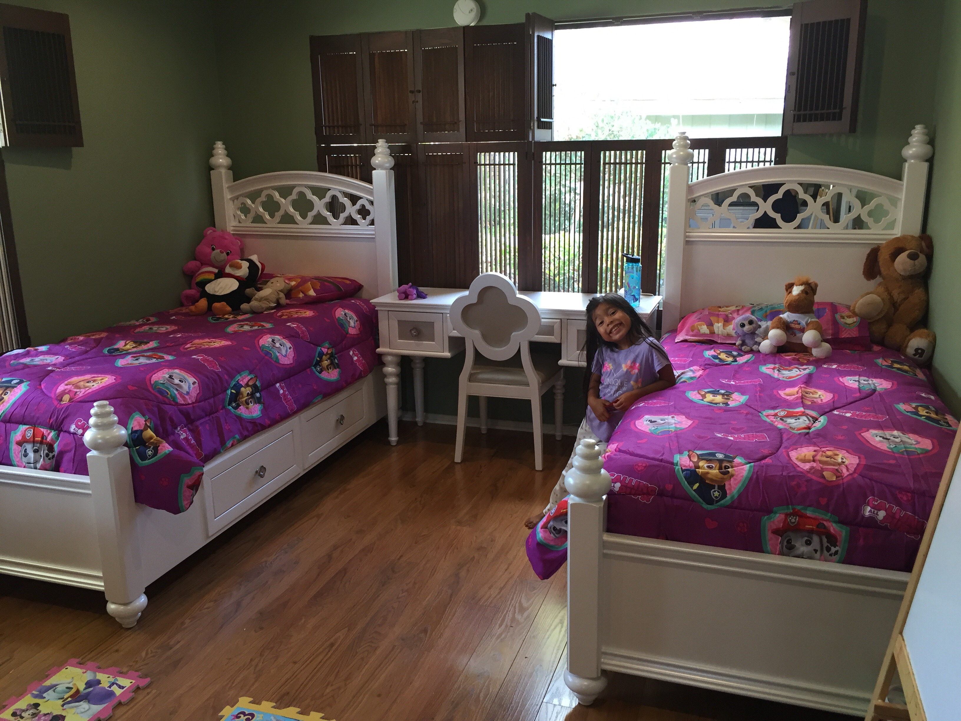 We decided to go ahead and get them each their own twin bed that they could grow into over the years. Since Elysse is only 20 months we got one of those hideaway rails so that she wouldn’t go flying off the bed at night. We also got them a matching dresser and the cutest little desk with chair since Celeste is at that age where she will be using a desk more.