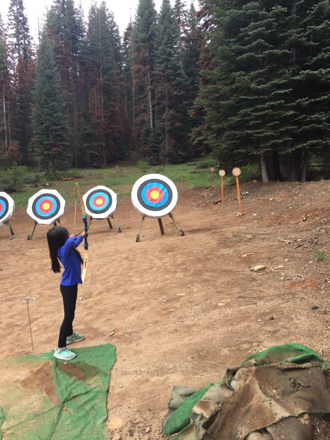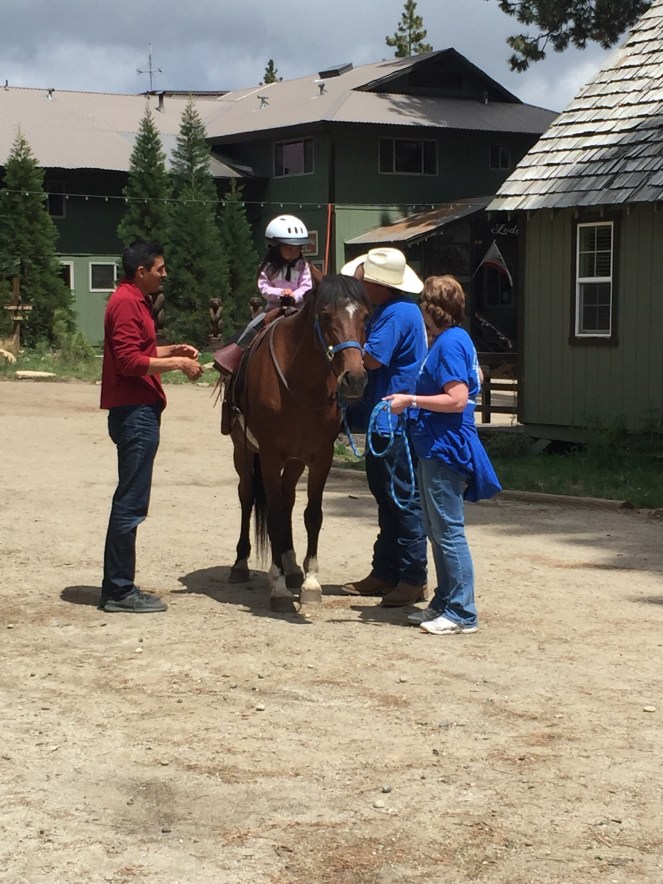 Here’s a picture of Celeste trying archery for the first time and Elysse playing with the camp counselors and riding a horse! She’s a natural!!