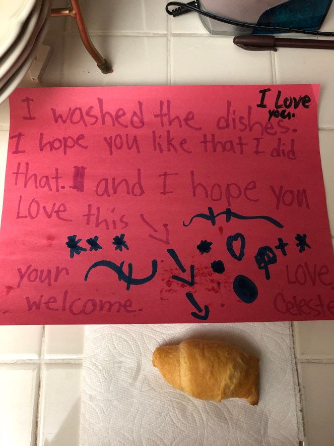 Guys, I can’t even tell you, this put a knot in my throat. It was the bonus I needed, the reminder that all those little things I am doing, they are not for nothing. They are for this, for these glimpses into my daughter’s heart. It wasn’t the fact she had washed the remaining dishes in the sink, which I was immensely proud and thankful for, it was the gesture and the note that showed me her thoughtfulness. Her kind heart. It came out of her to be helpful and to leave me that note which not only expressed her love for me, it also expressed her hope that I would like that she had done the dishes… that was better than any gift. It was my bonus, the reminder that those repetitive things I feel I’m sometimes doing, those tired moments…they mean something much greater than I can imagine.