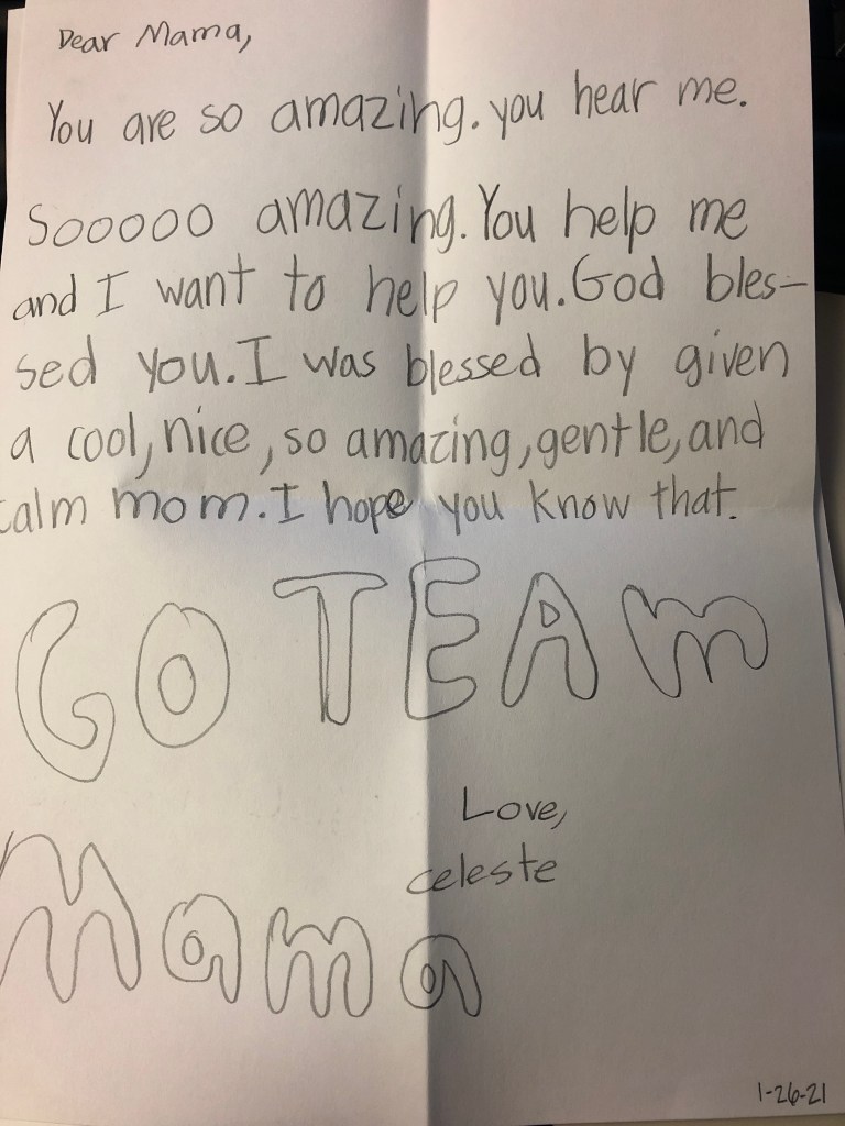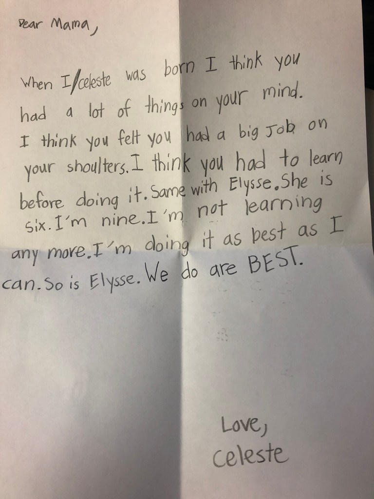 And then Celeste approached me and gave me a letter she wrote to me while her and Elysse were having breakfast.
