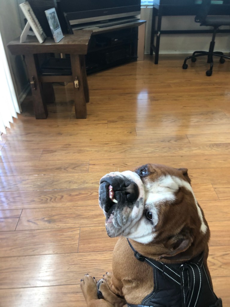 - Okay the harness he wears is brilliant for bulldogs, it’s got a small metal loop to clip the leash onto. But it also has this handle right in the center. And on occasions where he won’t budge or let go of a pine cone, my husband has picked him up like a carry on luggage from the handle. What a sight! Haha!